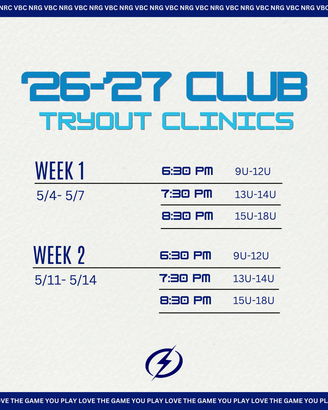 We are so excited for the upcoming 2026–2027 club volleyball season and can’t wait to welcome both our returning and new athletes back into the gym this summer! It’s always a great time to grow, compete, and build our program together. We’ve included all important dates and the first two weeks schedules for our summer tryout clinics, and we look forward to seeing everyone there!